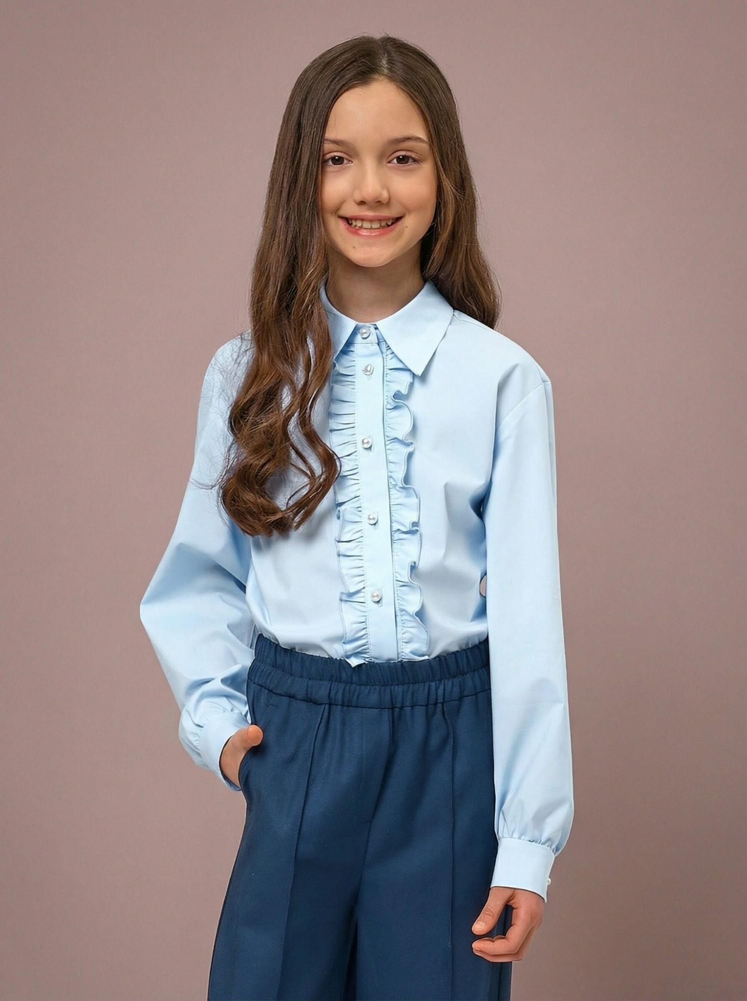 Блуза с оборкой по планке - лаконичная, сдержанно нарядная, она будет уместна для любого случая – для школы, для праздника, для повседневной носки, для прогулок и походов в театр.