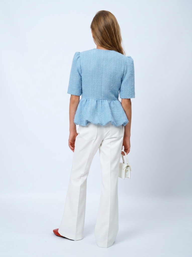 Жакет из фактурного твида с выразительной баской - интерпретация классического couture-силуэта. Приталенный силуэт, декоративные пуговицы, безупречная форма. Элегантная база для продуманного образа.