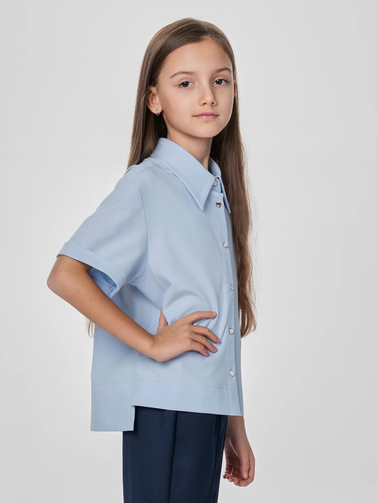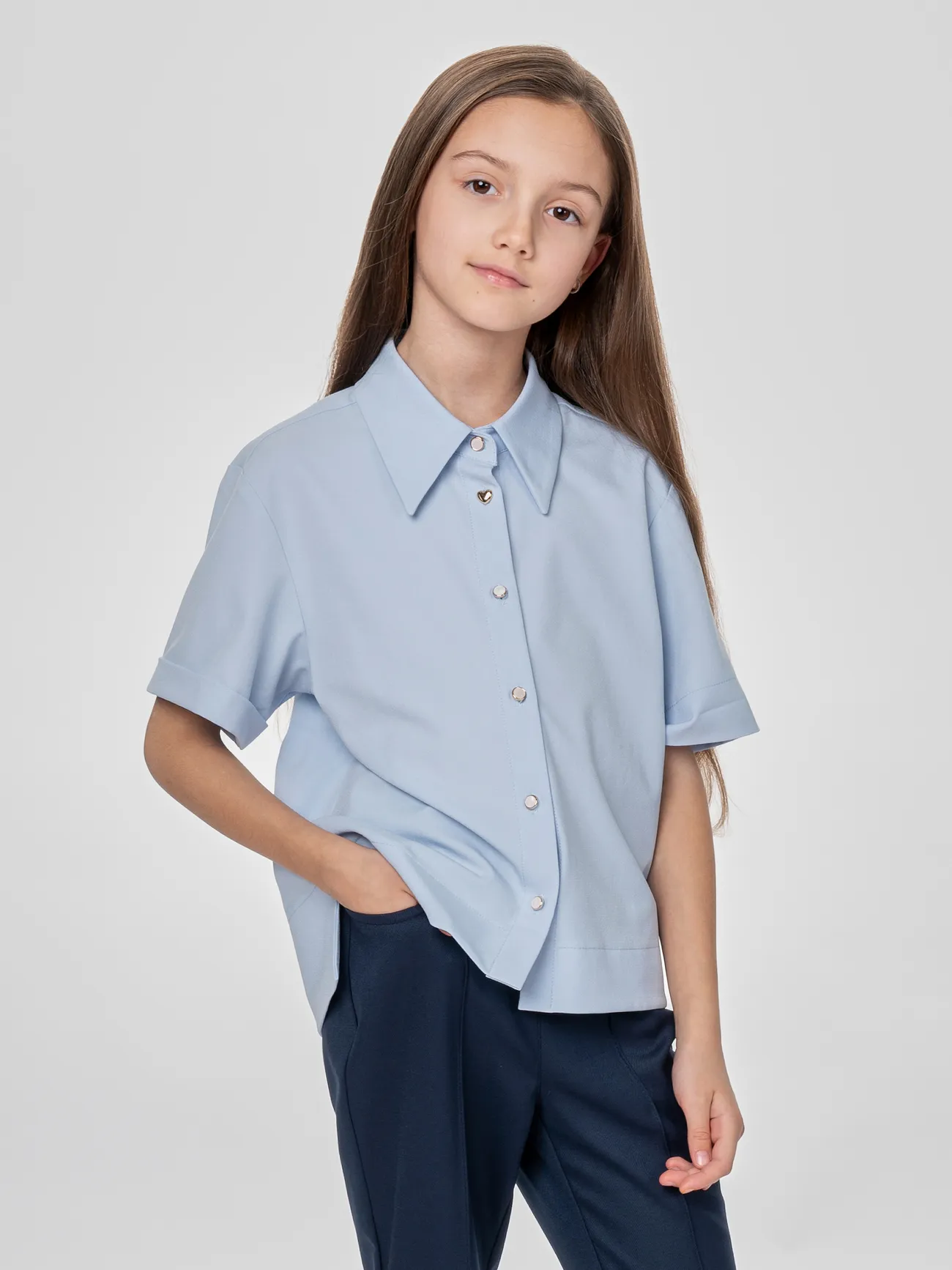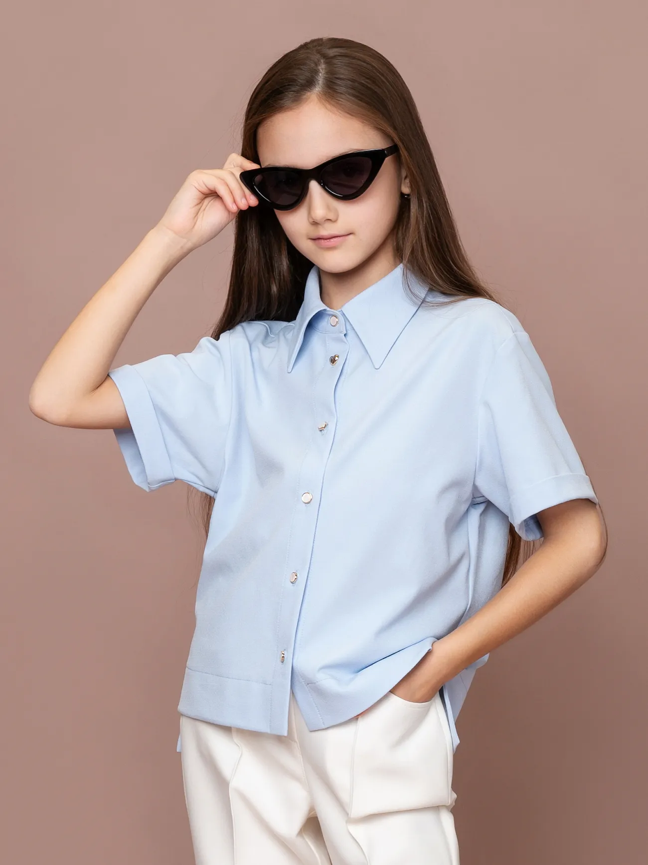 Укороченная рубашка с декоративными пуговицами – свежий взгляд на классические рубашки, сочетающий в себе официальную строгость и каплю кокетства. Рубашка прекрасно впишется в школьный гардероб, но не оставит обладательницу без нотки индивидуальности. Лаконичная, сдержанно нарядная, эта модель выполнена из легкой, практичной и приятной на ощупь ткани. Рубашка отлично сочетается с юбками, брюками, юбками-шортами Ole!twice, прекрасно вписывается в образы для официальных мероприятий, посещения театра, прогулок и фотосессий.