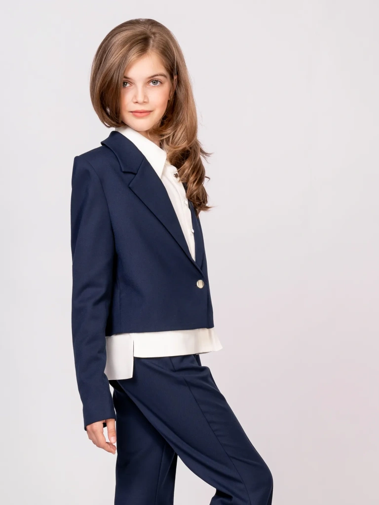 Современная интерпретация классического школьного пиджака. Лаконичный крой, подчеркнутая линия плеч и укороченная длина создают утончённый, архитектурный силуэт. Однобортная застёжка и идеальная посадка делают этот жакет универсальным элементом школьного гардероба — сдержанным, но с характером. Гармонично сочетается как с брюками, так и с юбками из коллекции.