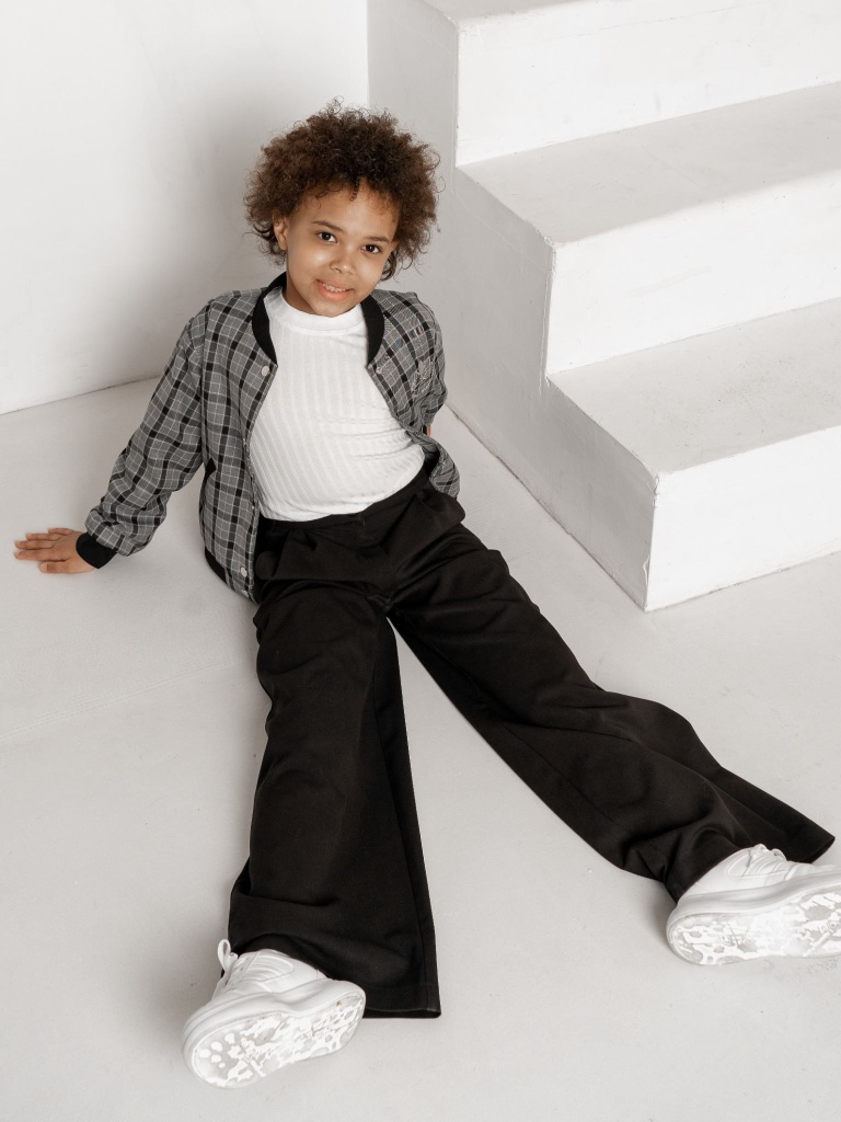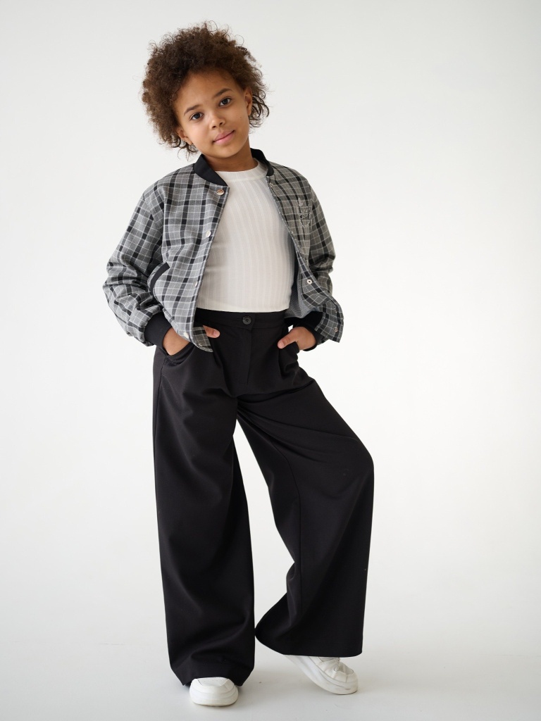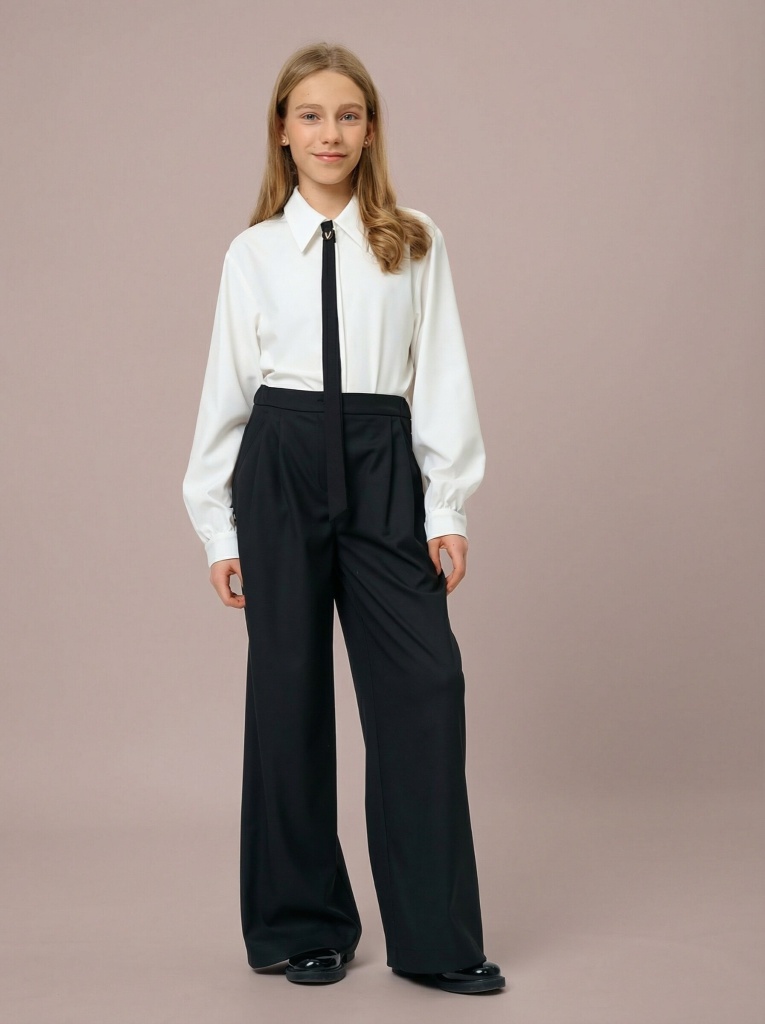 Широкие брюки – для школы, для прогулок, для нарядных образов. Модель палаццо с высокой посадкой – удобная, стильная и универсальная. Фасон брюк отличается широкими длинными штанинами, что позволяет зрительно удлинять силуэт. Свободный крой модели не стесняет движений во время ходьбы, придавая изящность и легкость образу. Брюки станут отличной школьной базой, они идеально сочетаются с блузами, жилетами, жакетами и бомберами Ole!twice.