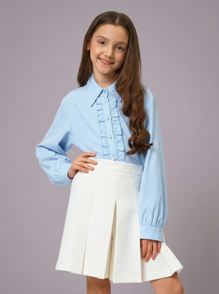 Юбка-шорты в складку – стильная и практичная модель для школьного и повседневного гардероба. Юбка-шорты отличается интересным кроем: спереди это юбочка со встречной складкой, сзади – шорты строгого силуэта. Модель имеет универсальную длину чуть выше колена. Пояс с регулирующейся резинкой обеспечивает идеальную посадку.