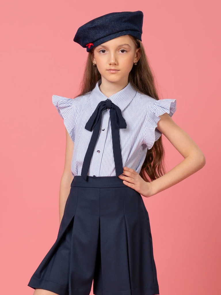 Элегантная блуза, украшенная романтичными воланами на плечах. Модель выполнена из легкой дышащей ткани, обеспечивающей комфорт в течение всего дня. Воротник дополнен декоративным съемным бантом, придающим образу изысканность и стиль. Идеально подходит как для школьных мероприятий, так и для торжественных случаев.