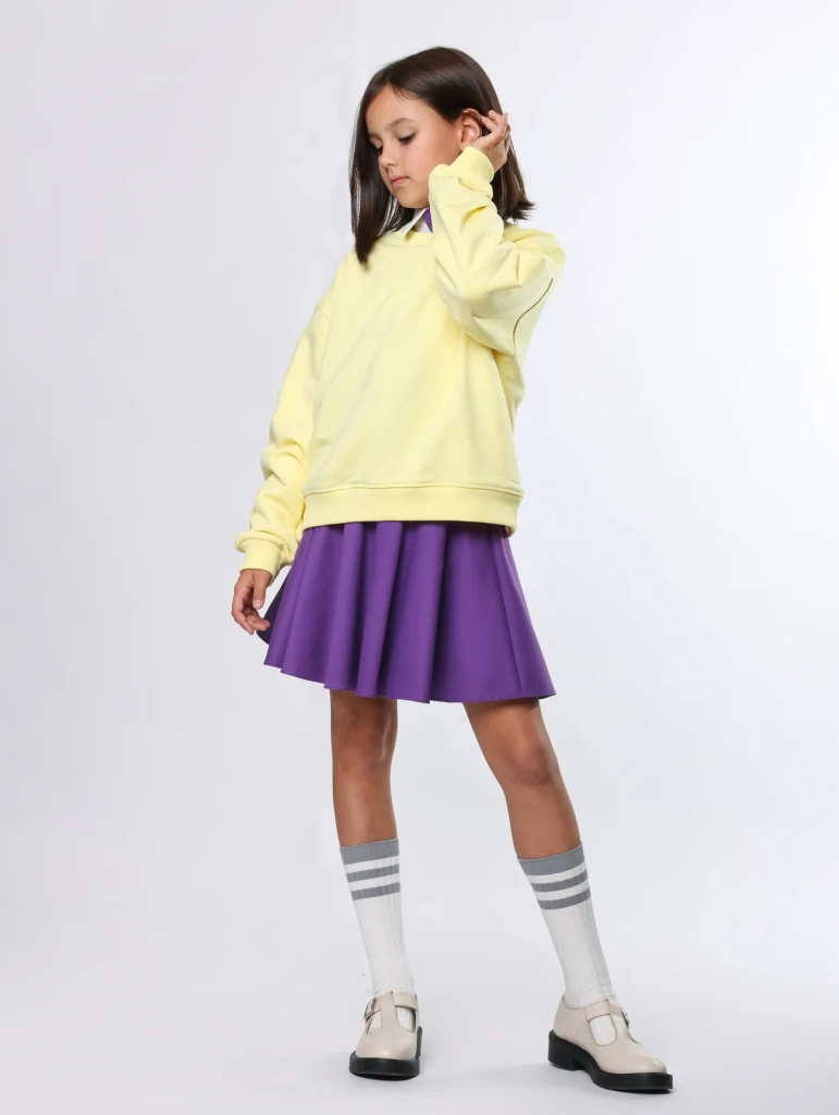 Юбка-солнце на кокетке – обязательный элемент гардероба поклонниц женственных образов. В образах с блузой, свитшотом или жакетом модель играет роль нестрогого, кокетливого предмета, подчеркивая принадлежность к преппи-стилю. Крой солнце-клеш в сочетании с широкой кокеткой создает изящный кукольный силуэт. Костюмная ткань красивых и актуальных оттенков подчеркивает все выигрышные детали дизайна и отлично сочетается с базовыми предметами гардероба в стиле Ole!twice.