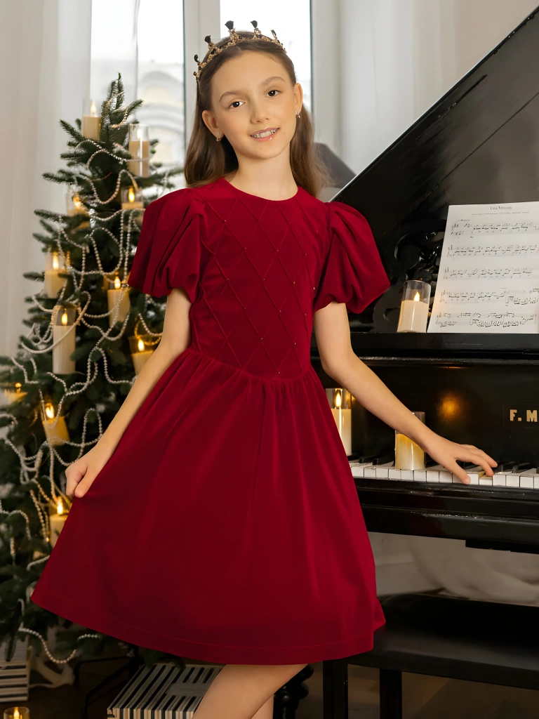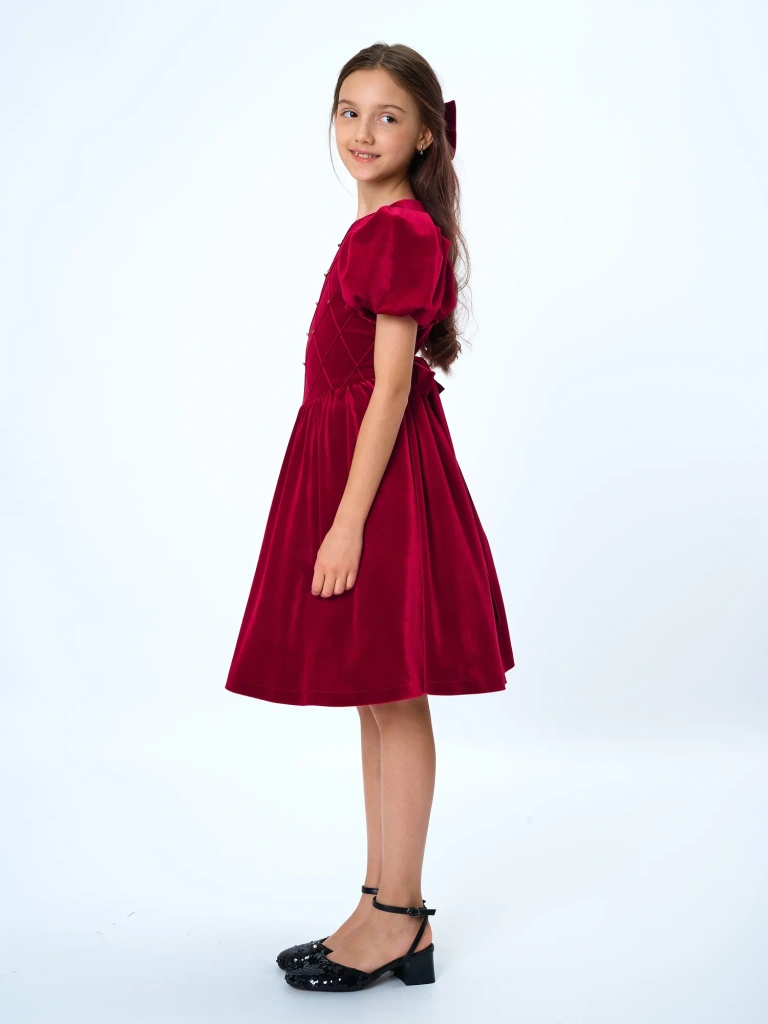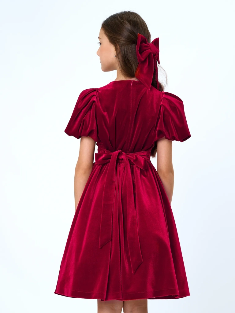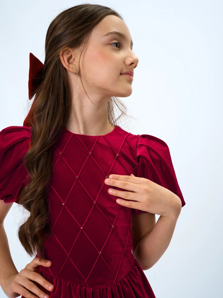 Роскошный набивной бархат в сочетании с деликатным блеском кристаллов дарит платью статус праздничной классики. Объёмные рукава и мягкая драпировка придают силуэту элегантность. Модель, созданная для самых особенных событий.