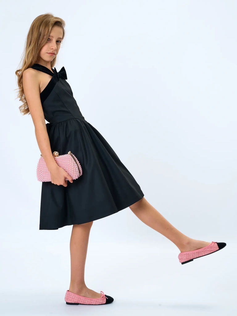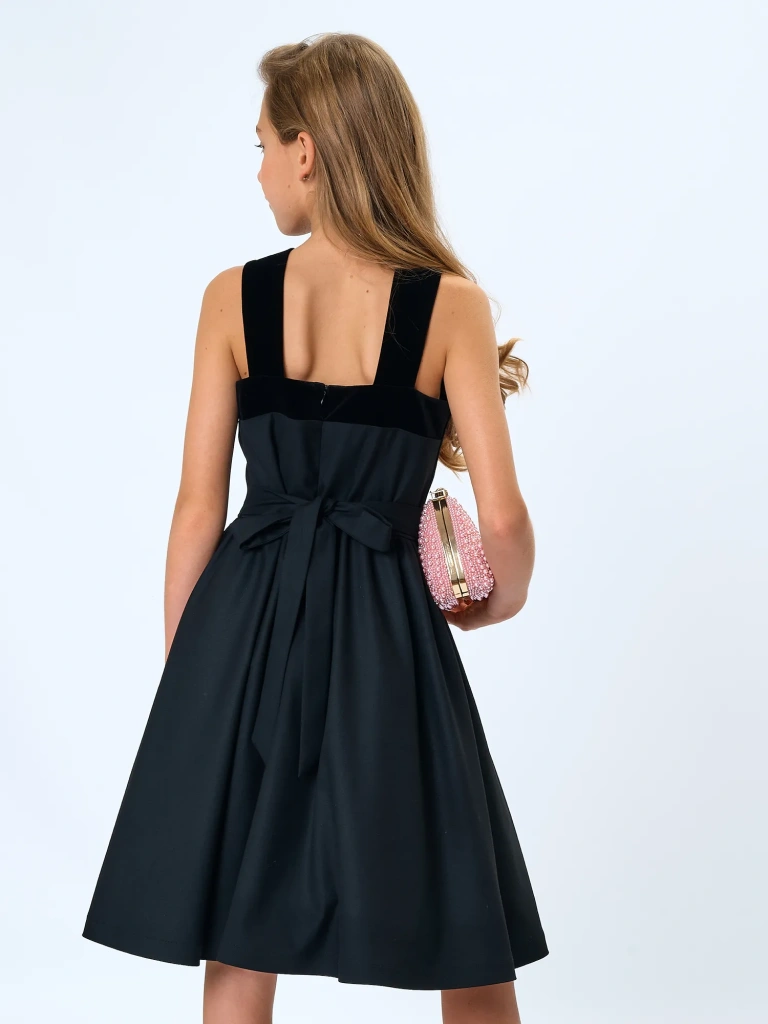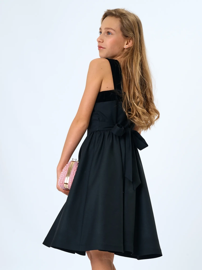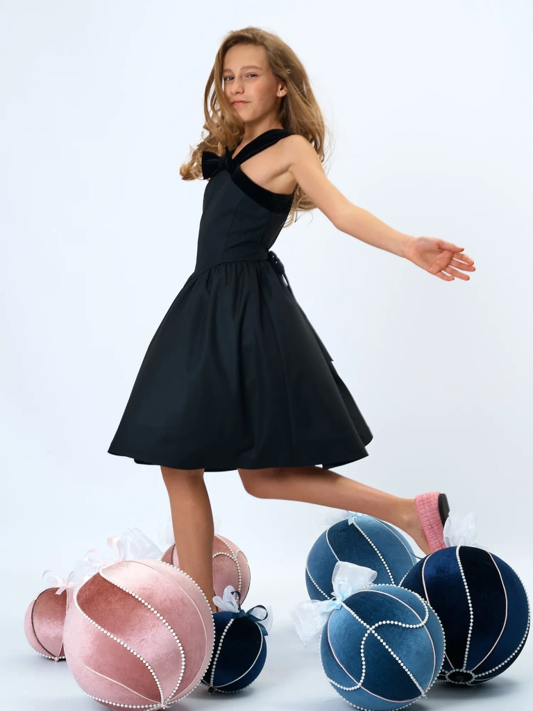 Черное платье с бархатной отделкой, выполненной в минималистичной, но выразительной манере. Игра фактур делает образ благородным и сдержанно роскошным. Наряд, вдохновлённый эстетикой маленького чёрного платья.