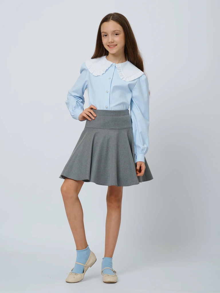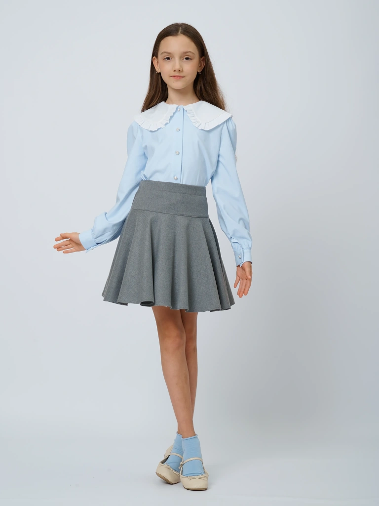 Блуза с акцентным воротником, украшенным кокетливой синей рюшей – нарядный и элегантный предмет гардероба. Блуза идеальна в сочетании с юбками и брюками, а также с джинсами палаццо для создания более расслабленного, но при этом очень женственного образа. Дизайн блузы вдохновлен элегантным и аристократичным образом Мэри Поппинс, а также стилем британских школ, который всегда вне времени.