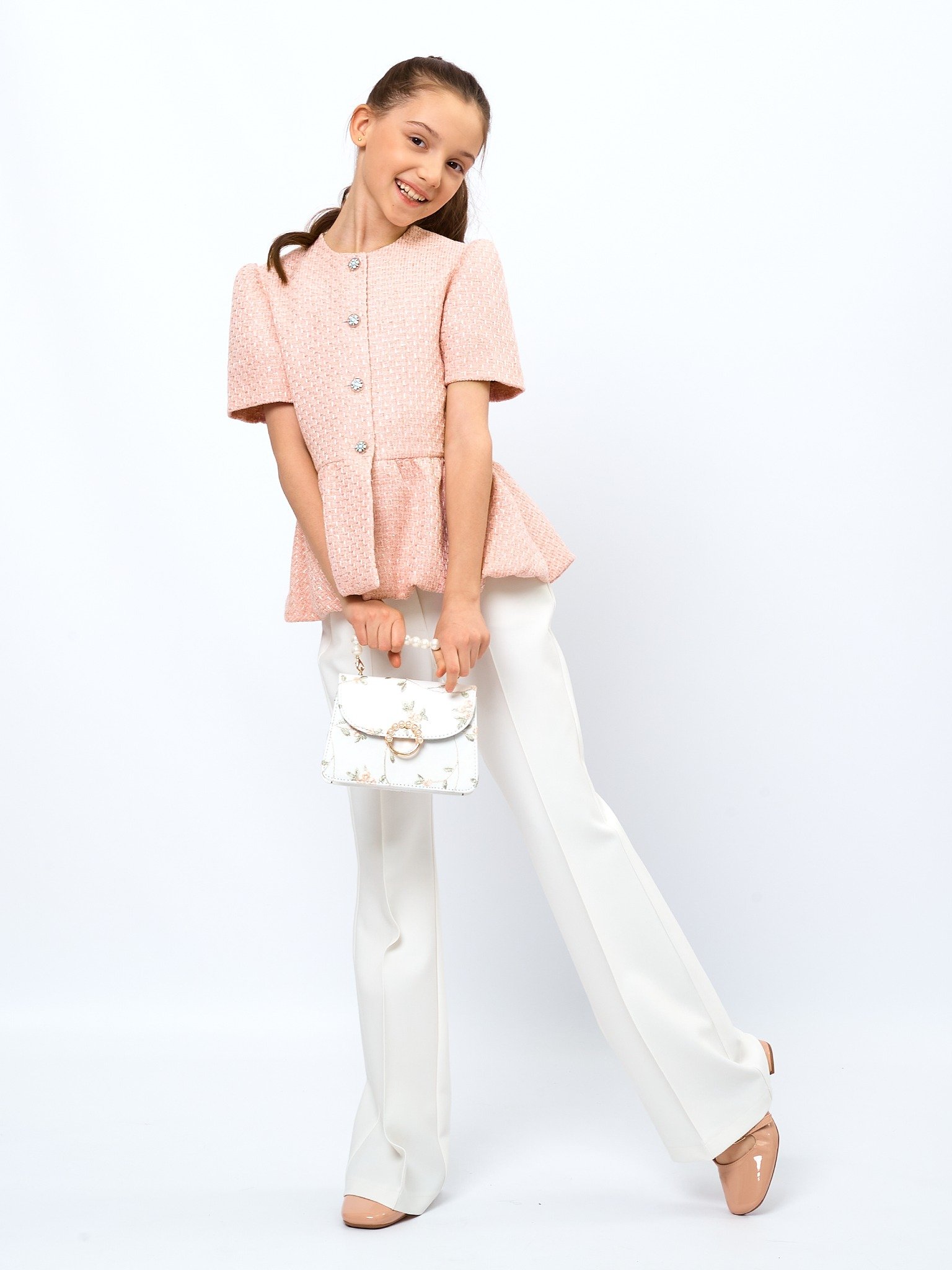 Жакет с баской из твида в цвете: Розовый