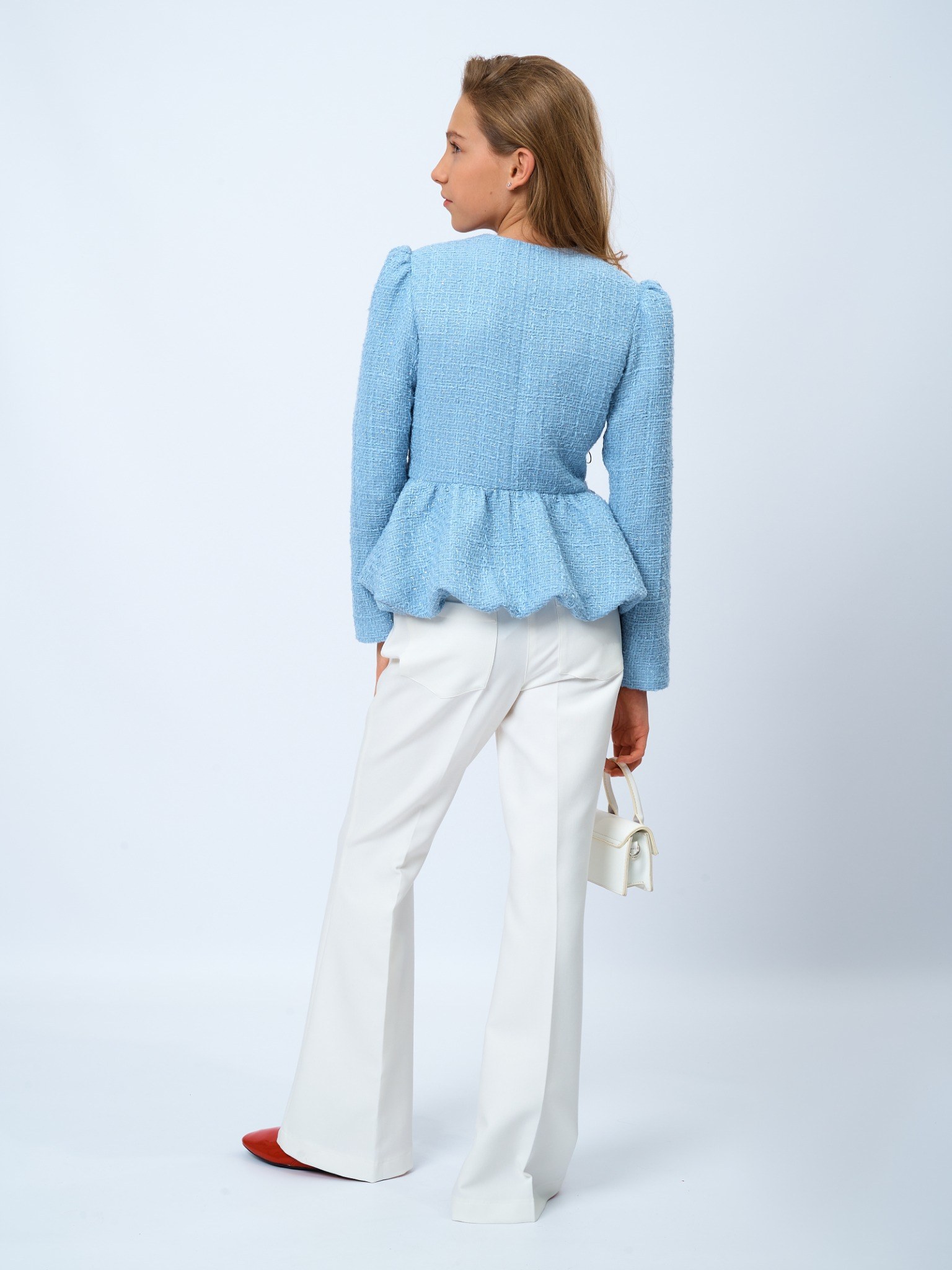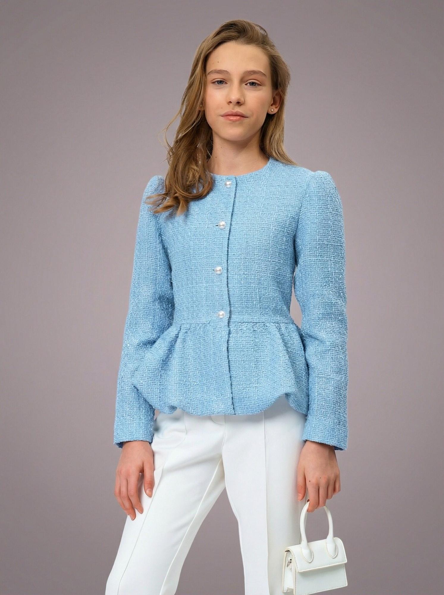 Жакет с баской из твида с длинным рукавом в цвете: Голубой