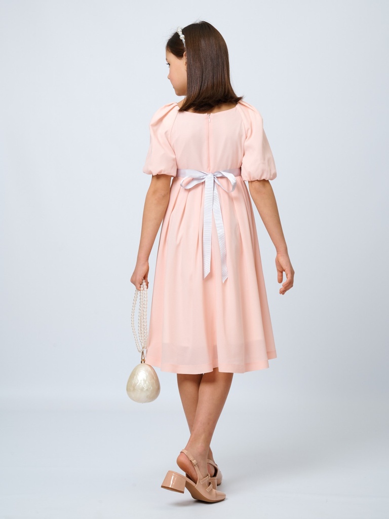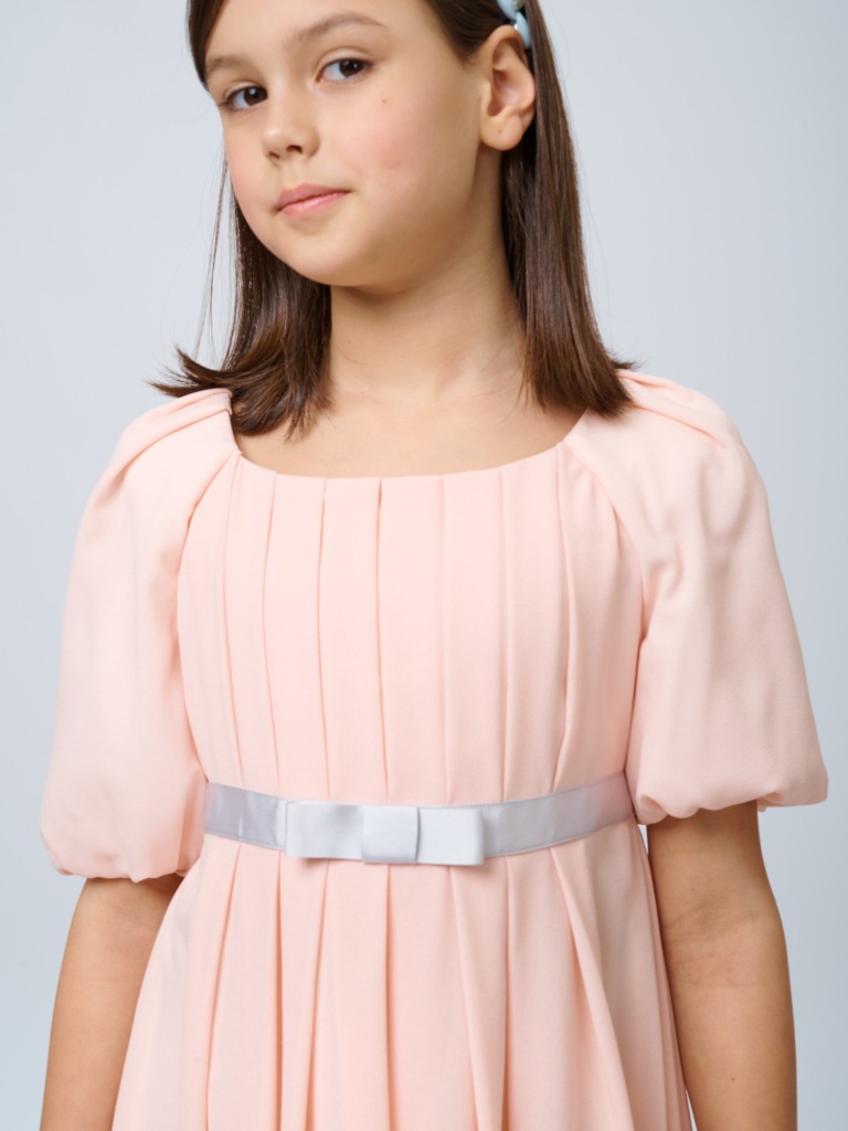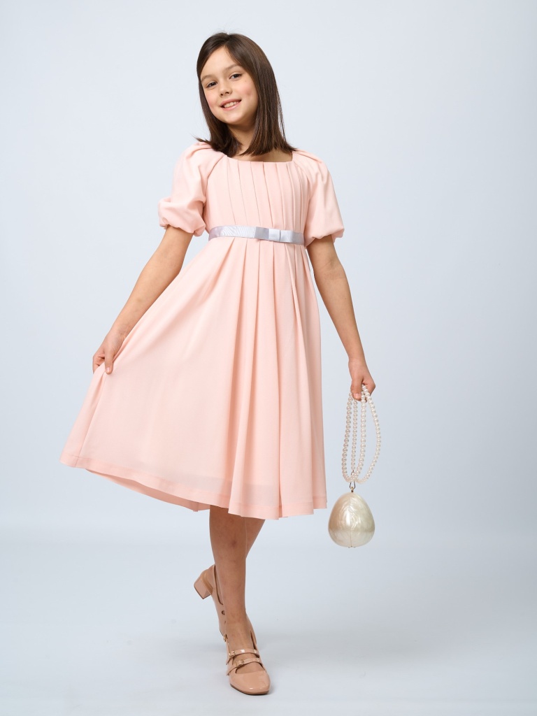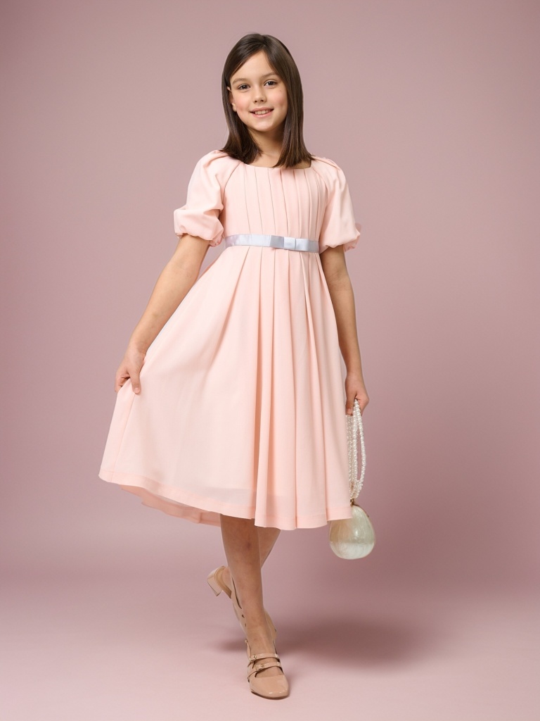 Изысканность, воздушность, нежность и легкость – все это про романтичное платье с драпировкой. Выполненное из невесомого крепа, оно позволит почувствовать себя настоящей принцессой из волшебной сказки. Драпировка на лифе и пояс с бантиком из репсовой ленты не оставят равнодушными ни одну юную любительницу нарядов.