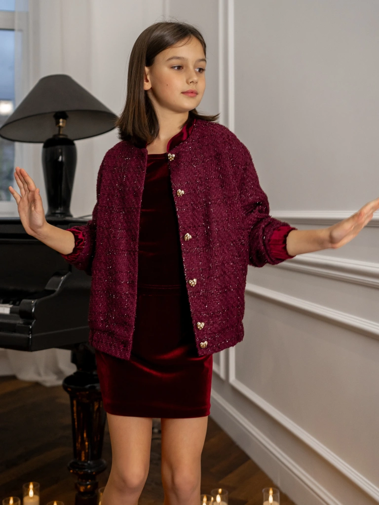 Бомбер из твида — воплощение элегантности и комфорта. Лаконичный крой, фактурная ткань и изящные декоративные пуговицы создают изысканный образ, который легко впишется как в школьный, так и в повседневный гардероб.
