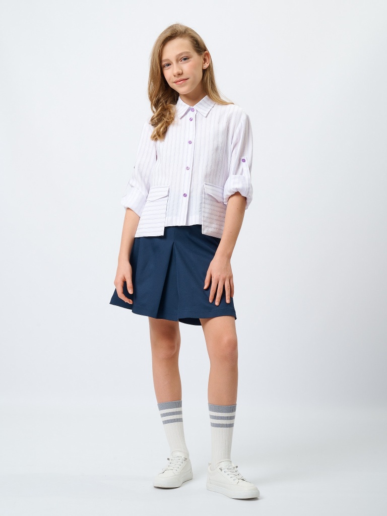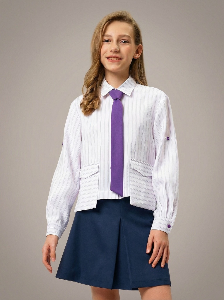 Рукава можно носить классически или подвернуть и зафиксировать на хлястик; удобно для школы и активного дня. Рубашка идеально собирается в комплект с юбками, брюками и жилетами, а с галстуком превращается в готовый торжественный образ.