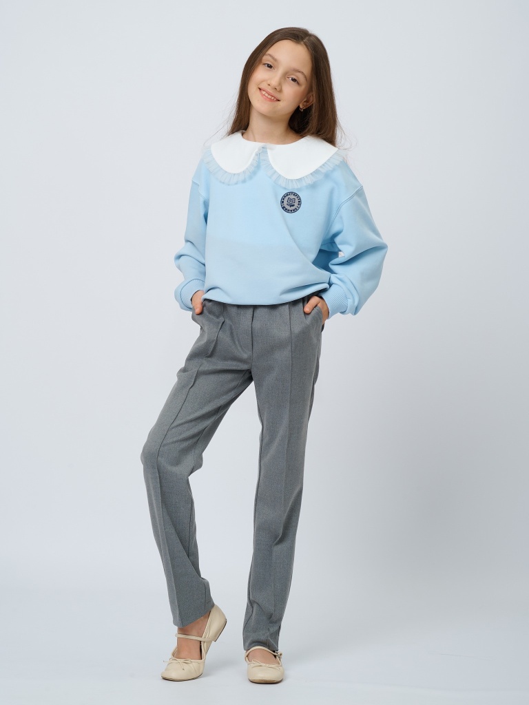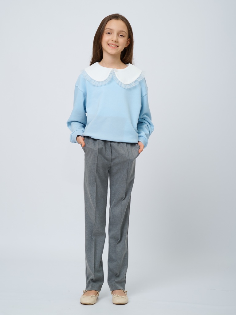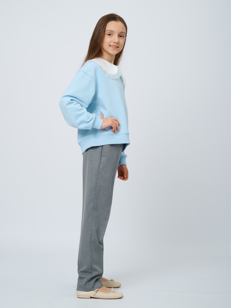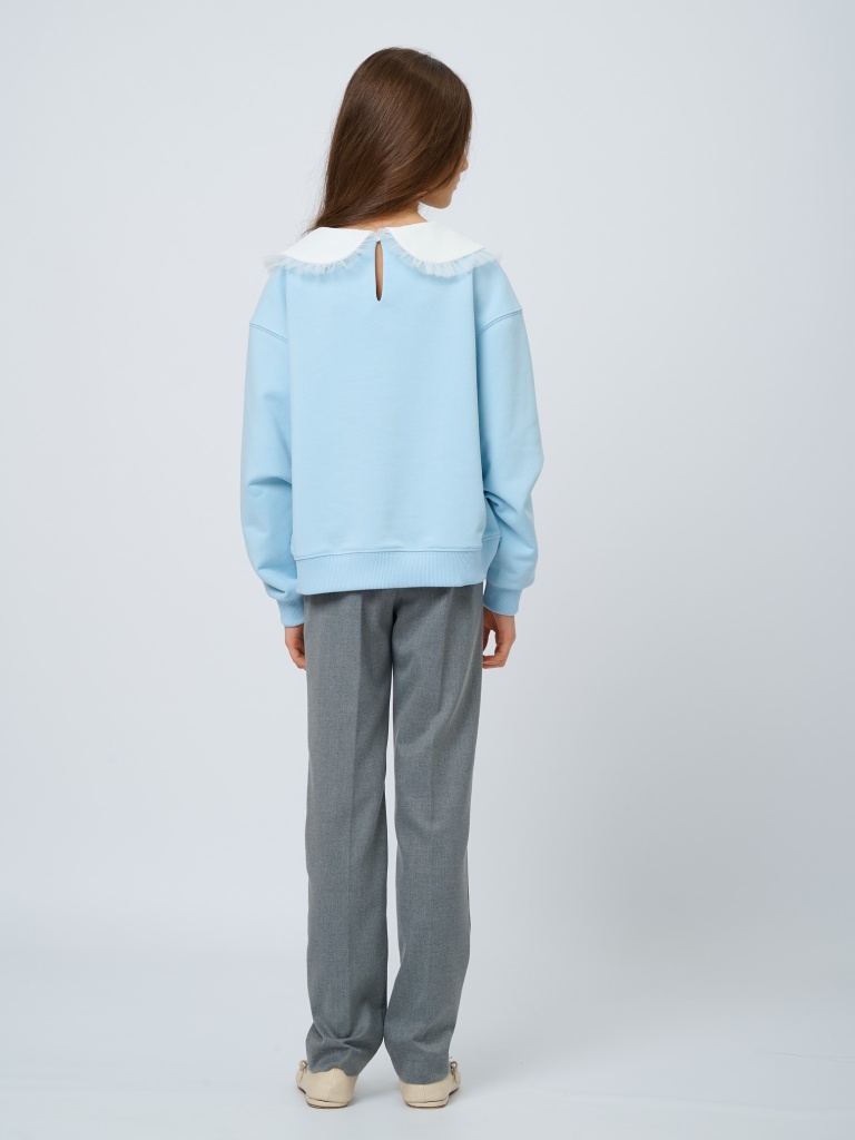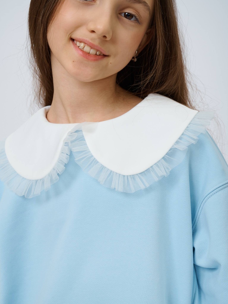 Свитшот с белым воротником – комбинация привычного комфорта с изящными, праздничными деталями. Нежные цвета и аккуратный воротничок с оборкой из полупрозрачной сетки создают легкий и воздушный образ, подходящий и для повседневных занятий, и для особых случаев. Свитшот выполнен из высококачественного футера-трехнитки с добавлением полиамида (20%) - он не только красиво сидит на фигуре, но и сохраняет форму и вид долгое время благодаря своим превосходным свойствам.