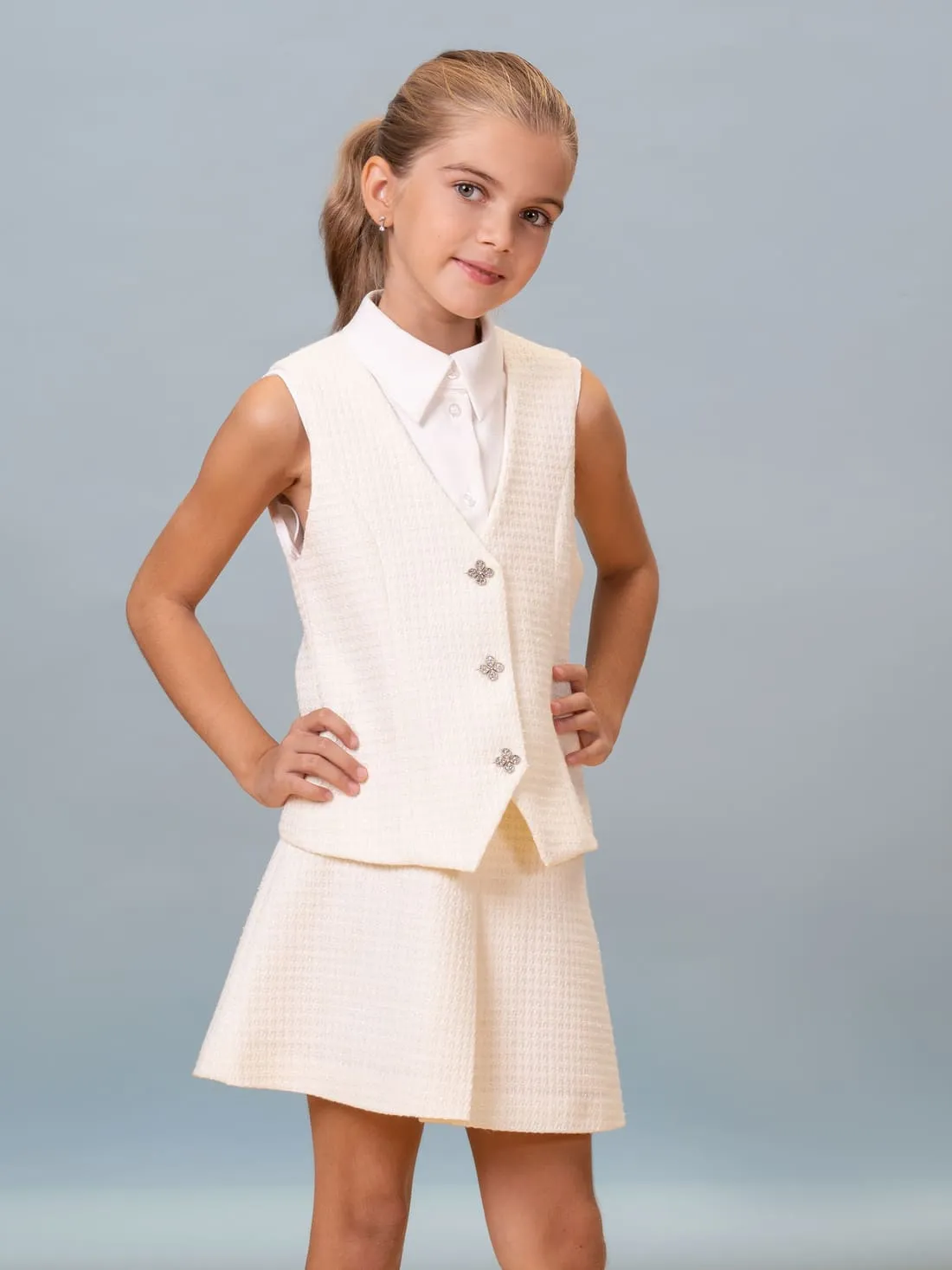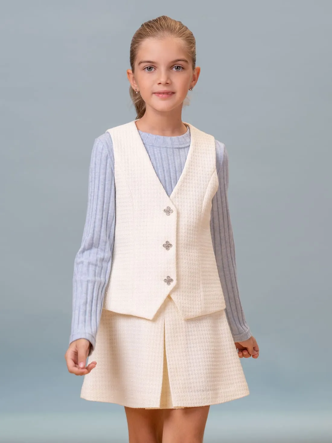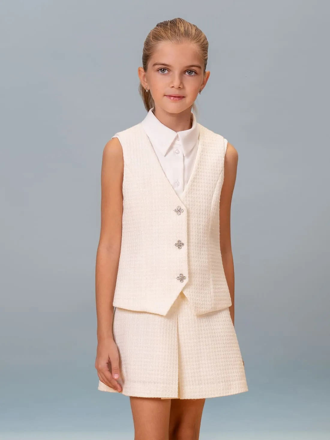 Жилет из твида – яркий акцент для повседневного или торжественного наряда. Полуприталенный силуэт обеспечит посадку по фигуре, а декоративные пуговицы со стразами послужат элегантным украшением. Отлично подходит как для создания стильного многослойного образа, так и для монокомплекта с жакетом (арт. 7235031) и шортами (в горчичном цвете - арт. 7235033)/юбкой (в молочном цвете – арт. 7235044)