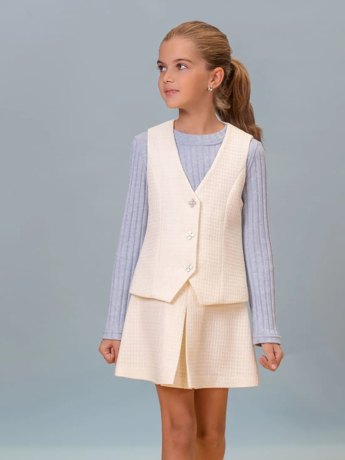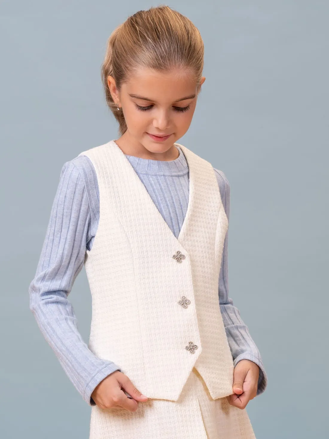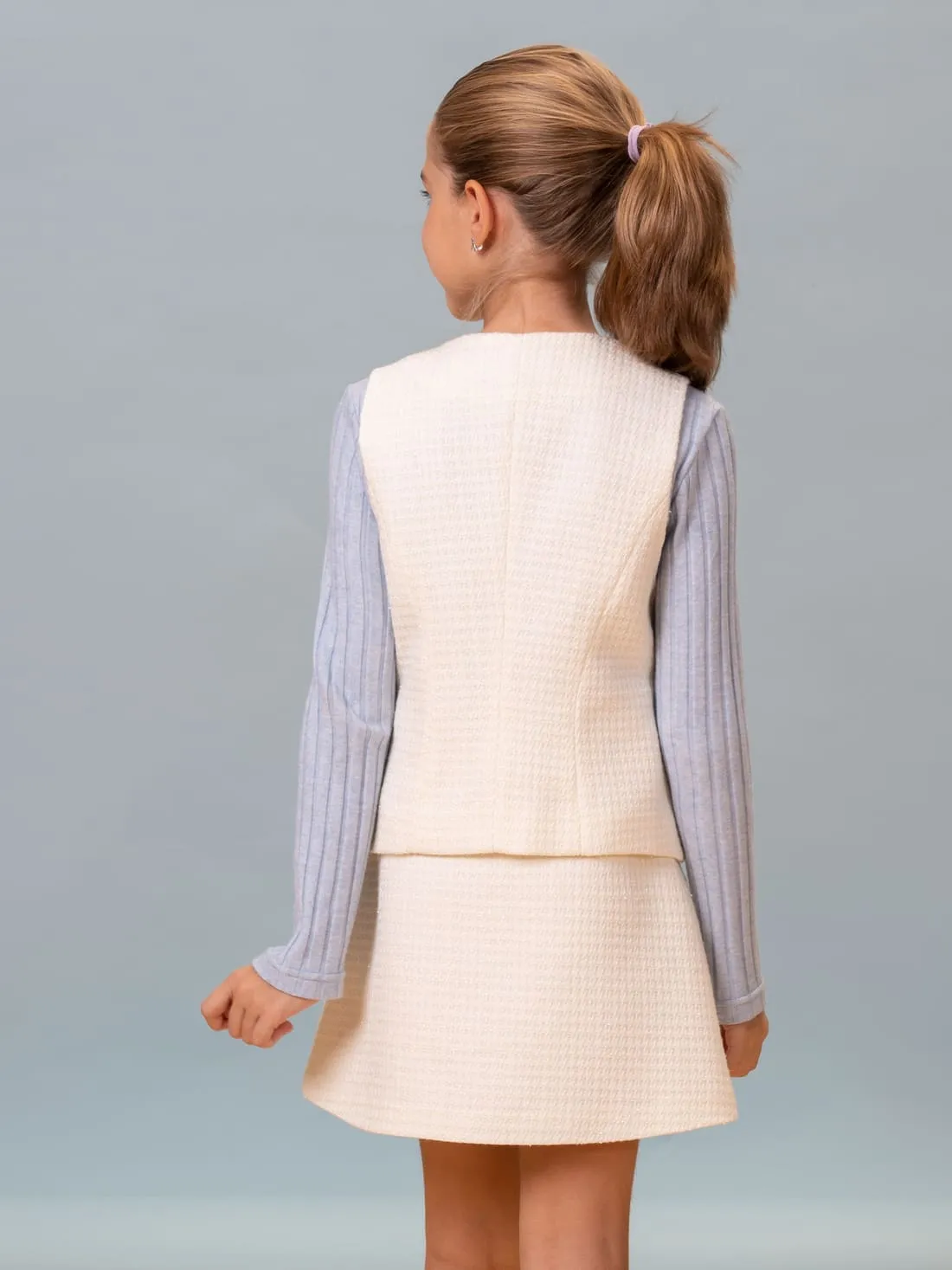Жилет из твида – яркий акцент для повседневного или торжественного наряда. Полуприталенный силуэт обеспечит посадку по фигуре, а декоративные пуговицы со стразами послужат элегантным украшением. Отлично подходит как для создания стильного многослойного образа, так и для монокомплекта с жакетом (арт. 7235031) и шортами (в горчичном цвете - арт. 7235033)/юбкой (в молочном цвете – арт. 7235044)